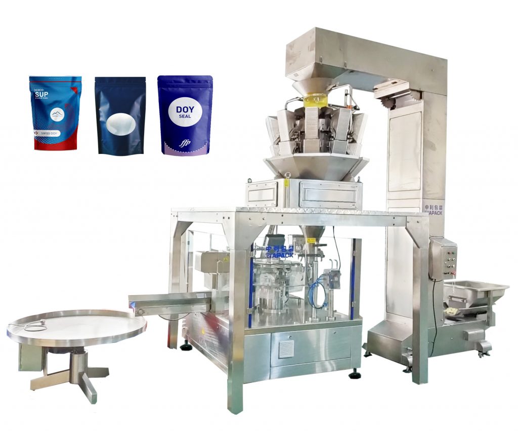 సామర్థ్యం మరియు స్థిరత్వం యొక్క 8 పని స్టేషన్లతో కూడిన ముందే చేసిన సంచీ నింపి ముద్రించు యంత్రం, స్టాండ్-అప్ సంచి, జిప్సం బ్యాగ్, చిమ్ము బ్యాగ్ మరియు అనేక ముందే తయారు చేయబడ్డ పాచెస్ యొక్క ప్యాకేజీని నొక్కిచెబుతుంది. వివిధ మోతాదు వ్యవస్థలతో (కలయిక బరువు / లీనియర్ వాయిగెర్ / అగర్ స్క్రూ / పిస్టన్ ఫిల్లర్) మరియు ఆటోమేటిక్ ట్రైనింగ్ కన్వేయర్లతో సహకరిస్తారు, ఇది విస్తృతంగా కణికలు, ద్రవ మరియు పొడిగా వర్తించబడుతుంది.